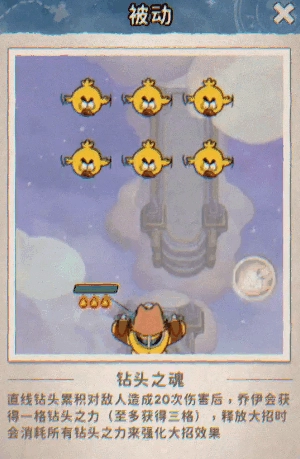 被动技能:【钻头之魂】 - 持续使用直线钻头攻击敌人,积攒能量,释放大招时消耗能量强化效果,用得越多,大招越强!