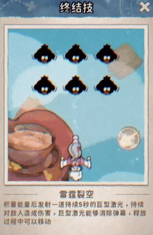 终结技:【雷霆裂空】 - 积攒能量后释放一道持续巨型激光,对敌人造成毁灭性打击,并能消除弹幕。释放期间可移动,灵活清场!