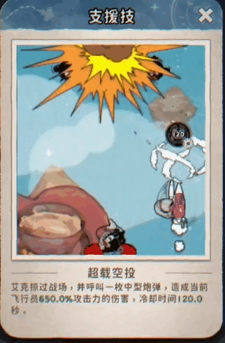 羁绊支援(艾克):【超载空投】——艾克紧急呼叫支援,随即驾驶战机风驰电掣般掠过战场,紧接着投下一枚中型炮弹。这枚炮弹威力惊人,对其爆炸范围内的敌人,造成极为强大的区域毁灭性打击!瞬间,空中支援降临,火力全面覆盖!