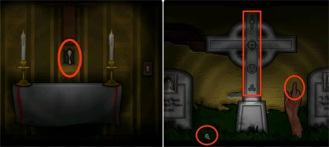 6、回到走廊最右边,把收集到的蜡烛和宝石分别放置在烛台与十字架上。拿到钥匙后,用它打开旁边的门,进入后院完成两座墓碑上的拼图。随后拿走左边出现的玩具钥匙,接着把戒指戴在右边手指上,从而获得第三张画像碎片。