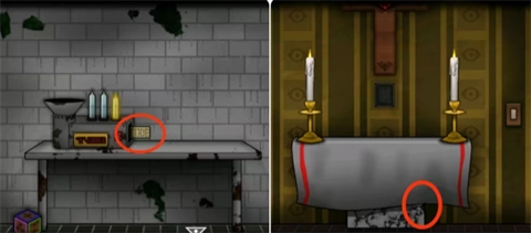 9、进入实验室根据旁边信封里的提示打开机器并放入鱼获得纸条,再到十字架处拿走桌布下方的银色十字架。