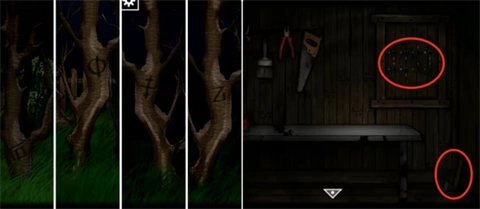 11、抵达后院后,留意树干上分布在三个场景的符号,凭借这些符号开启工具房的木门。进入房间,取走桌上的地图以及墙角的斧头,随后打开上方的机关暗格,获取栅栏钥匙。