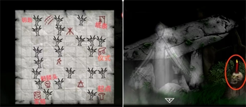 12、依照地图提示,打开栅栏后从起始位置启程,如上图所示,收集骷髅头、蜡烛以及纸条。随后,依据纸条上的指引前往仪式点展开操作,并用打火机将蜡烛点燃。