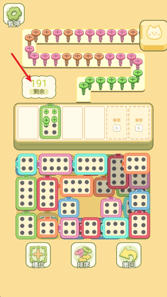 4、上方会呈现剩余螺丝的数目,把所有螺丝都拿走就能通关。