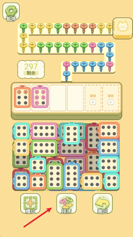 2、轻点下方的螺丝盒,它便会被放置到中间的空位处,与此同时,上方与之对应的螺丝会自动落入其中,待装满后便可取走。