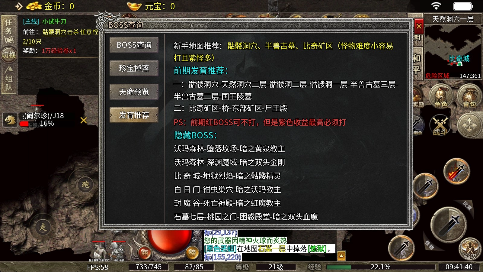 1、新手地图推荐:骷髅洞穴、半兽古墓、比奇矿区,这些图怪物难度小容易打且紫怪多。