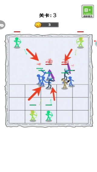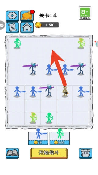 2、点击即可召唤不同类型的火柴人战士,通过拖动来调整他们的站位,打造出剑士在前、弓手在后这样的攻防阵容。