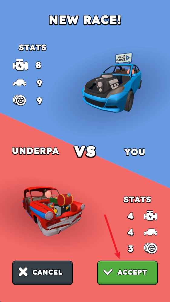4、当赛车组装完成后,我们能够点击左侧的RACE按钮开启比赛,待匹配到对手,比赛便可正式开始。