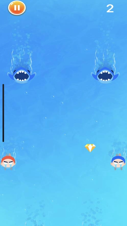 当人物触碰到钻石时,分数会增加1分;而一旦触碰到鲨鱼,游戏便宣告结束。