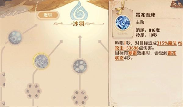 法师吟唱1秒后,将对目标造成315%的魔法伤害与53696的固定伤害,与此同时,会给敌方施加【寒霜】效果,使敌人进入【霜冻】状态,该状态持续4秒。释放此技能需消耗816点魔力值,且冷却时间为10秒。尽管冷却时间较长,但收益极高,还能对敌人进行控制,因此推荐优先升级这个技能。