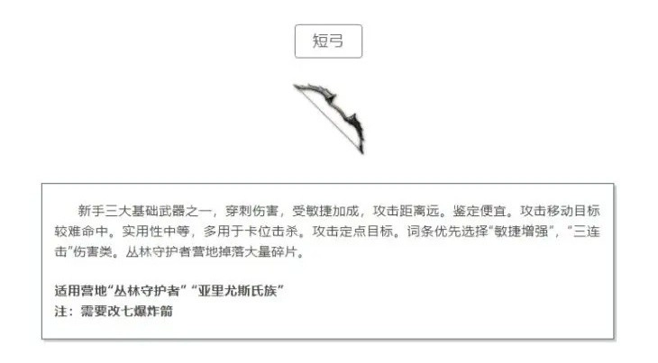 短弓,作为新手的三大基础武器之一,拥有穿刺伤害,其伤害受敏捷属性加成,攻击距离较远。它的鉴定费用较为低廉,然而在攻击移动目标时,命中难度较大,整体实用性处于中等水平,常被用于卡位击杀。当攻击定点目标时,在词条选择上,优先考虑“敏捷增强”以及“三连击”这类伤害型词条。 短弓的碎片主要掉落于丛林守护者营地。适用该武器的营地有“丛林守护者”营地以及“亚里尤斯氏族”营地。需要特别留意的是,短弓只有经过改造,配备上爆炸箭,才能发挥出更为强大的作用。