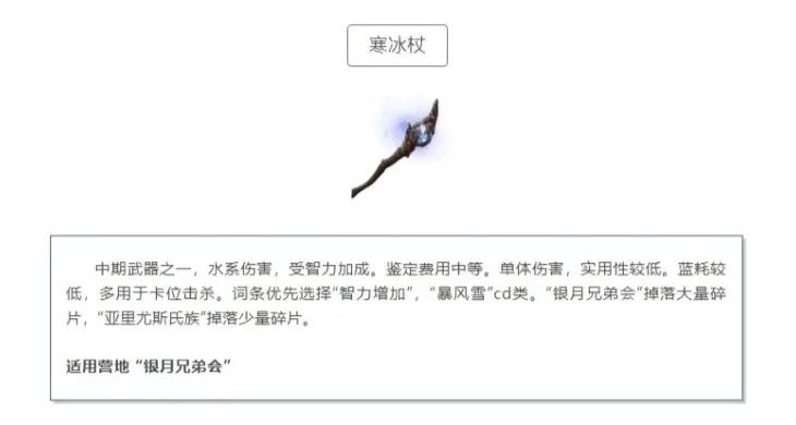 寒冰杖作为中期的另一款武器,能造成水系伤害,伤害受智力加成影响。其鉴定费用处于中等水平,单体伤害的实用性欠佳,不过蓝耗较低,常被用于卡位击杀。在词条选择上,优先考虑“智力增加”以及“暴风雪”CD相关类型。寒冰杖的碎片,银月兄弟会掉落数量较多,亚里尤斯氏族仅有少量掉落。该武器适用的营地主要是“银月兄弟会”。