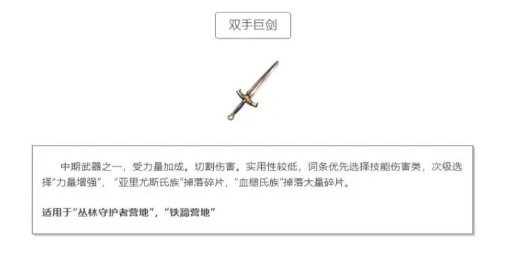 双手巨剑作为中期的另一款武器,其伤害受力量属性加成,造成的是切割伤害,但整体实用性不高。在词条选择方面,优先考虑技能伤害类词条,其次可选择“力量增强”词条。双手巨剑的碎片,亚里尤斯氏族有少量掉落,而血槌氏族则会大量掉落。该武器适用于“丛林守护者营地”与“铁蹄营地”。