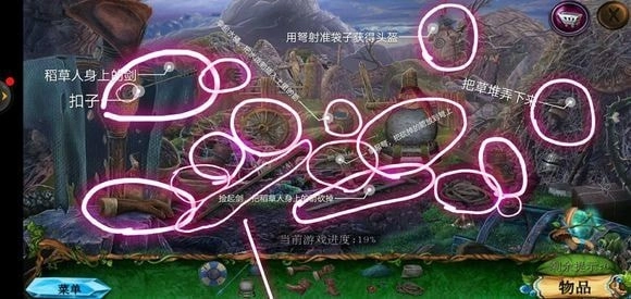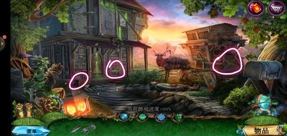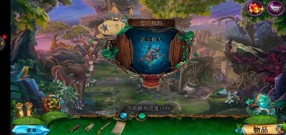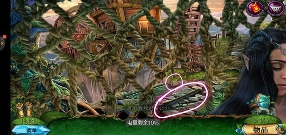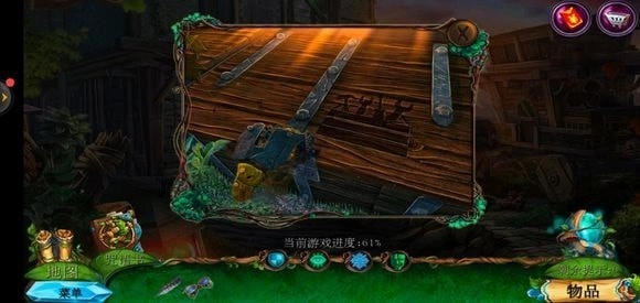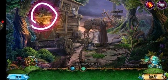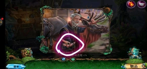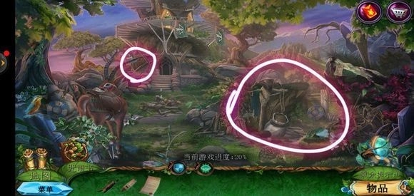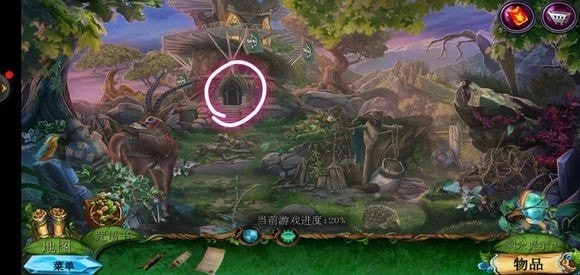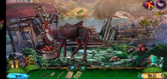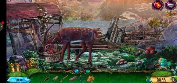 来到桥头位置,拿起锉刀将木牌上的链条锉断,从而获取铁链。接着,点击鹿的脖子,再使用小刀,就能得到方形嵌入物。