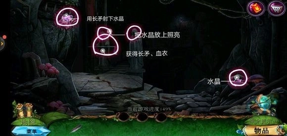 将血衣与水晶放置其上,即可获取彩色水晶。点击洞穴门,把彩色水晶放置于门处,便能进入小游戏。完成小游戏后,即可进入洞穴。