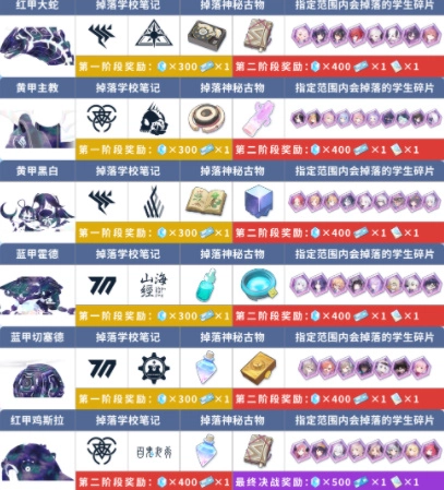 5. 若无法在规定时限内打倒BOSS,可消耗1张票再次入场,BOSS将继承上次未被击倒时的血量,已出战过的学生也能重复使用。