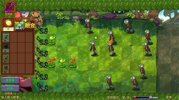 2. 于后排栽种向日葵,在前排种植豌豆射手用以抵御僵尸。
