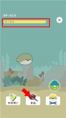 1. 成功孵化后,就能给萨卡班甲鱼投喂食物啦。萨卡班甲鱼的饥饿程度,可以通过上方的黄色进度条来知晓。投食的时候,点击下方的食品按钮就行。