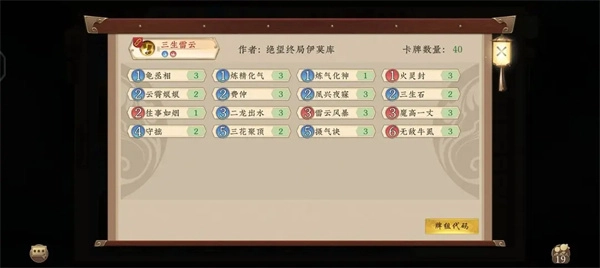 三生石搭配五庄观与龟丞相,等同于能够无限使用的1费抽1牌效果;在通过大量抽牌并将其转化为修为后,利用雷云风暴实现斩杀。