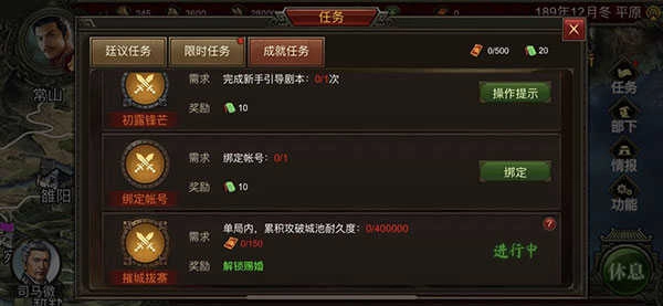 2、完成教程后,随意开启一局正常剧本,就能瞧见右边的任务图标啦。图标里面的限时任务(需看广告)以及成就任务,都是后续免费获取资源的重要途径之一。每天能看6次玉符广告,每次可得4玉符,算下来4×6 = 24。此外,累计观看广告还能完成日积月累任务,进而获得礼券,礼券可替代部分玉符功能用于消费哦~
