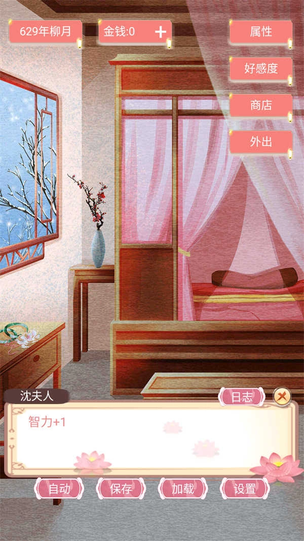 3、游戏正式开启后,会涌现出新的功能。其中,“属性”能用于查看主角的角色面板;“好感度”可用来查看各个男主对女主的好感程度;“商店”能够购买道具以供使用;“外出”则可以推动剧情发展。