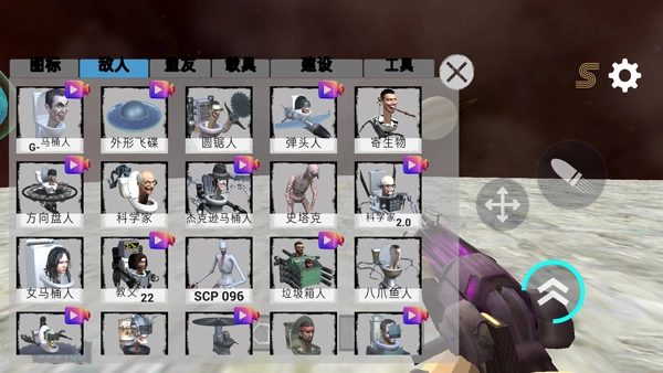 3、点击左侧箱子按钮,玩家可选择要添加的敌人,如马桶人、圆锯人、弹头人、寄生物、外星飞碟等;