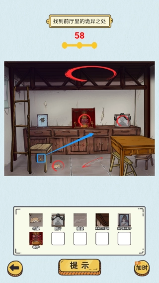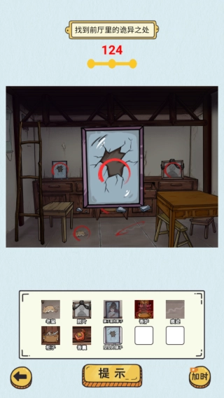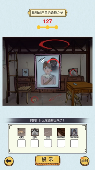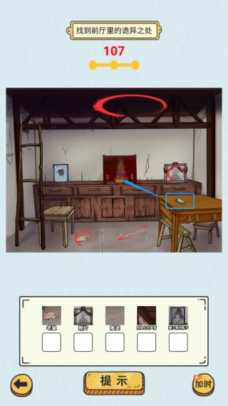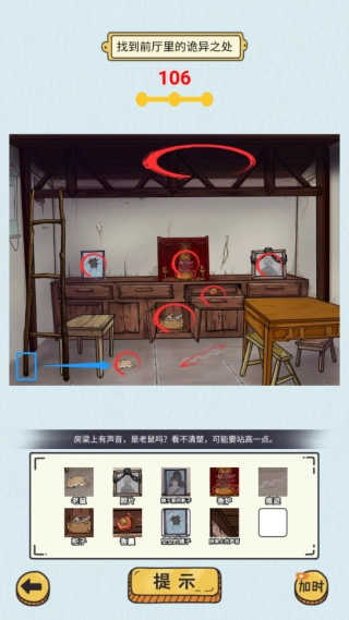 4、进入第三个场景,首先点击图中红圈圈出的部分:照片,老鼠,蛇皮,屋檐,点击房间的镜子就会出现镜子中的身影