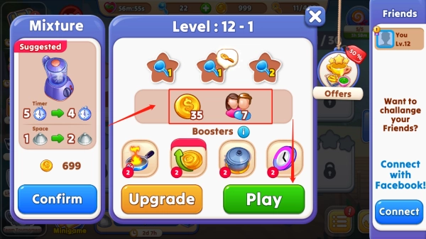 2、如12-1关,本关卡过关要求玩家在7个顾客手中赚取35金币