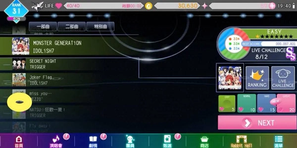 在主界面,我们不仅能够自由挑选歌曲,还能够选择歌曲的难易程度。爱娜娜的歌曲大致有四个难度级别,分别是【EASY】