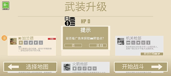 1. 观看广告即可获取荣誉点,当荣誉点累积到一定程度,就能解锁其他兵种。
