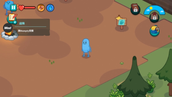 4、按照左侧任务提示展开游戏,右侧背包具备存放和取出物品的功能,地图上方会依据游戏世界的真实时间产生变化,玩家需留意自身的生命条、饱腹感等要素。