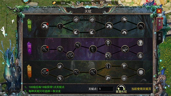 (4)第二套天赋推荐选择攻击或防守方向,以此提升PK能力,如此一来,一套天赋用于打怪,一套天赋用于PK,两者兼顾!