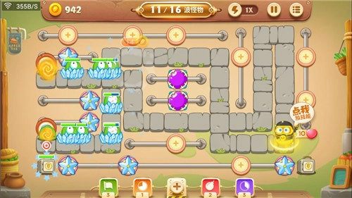 前期主要依靠魔法球进行输出,为以防万一,可在魔法球附近放置一个冰冻星,利用其减速效果,这对后续清除障碍物十分有帮助。