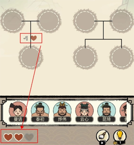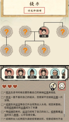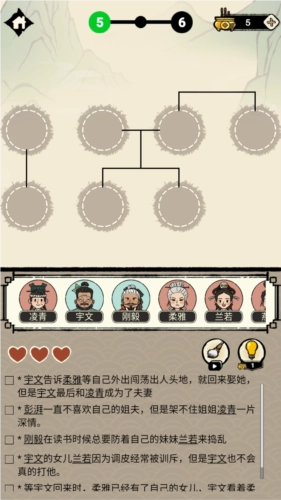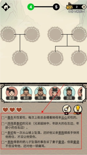 2. 当进入关卡后,玩家需依据下方的文字提示,把人物头像拖拽至上方适宜的圆框内,以此来完成族谱的修缮。