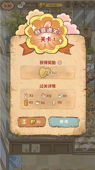 5、在喵之料理大师游戏里,每当成功挑战一关,就能获得对应的关卡资源奖励。