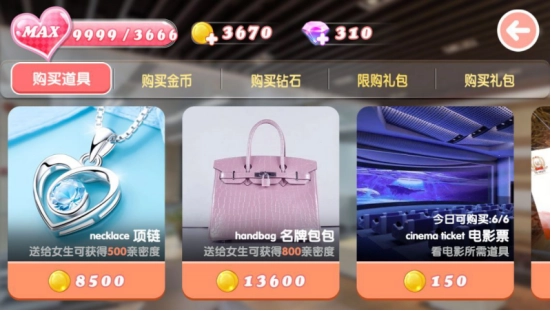 如今,有些新手已经开始明白要送段位稍高些的礼物啦,送这类礼物能获得两位数的亲密度呢,就像这句流行语说的:爱她就送她口红,恋她就送她香水!然而,经验丰富的“老司机”们看到这种情况,只是会心一笑,因为更高级别的礼物还在后面呢:项链一送出,对方频频回头,包包一递到,从此再也赶不走!送这类礼物,你能一次性获得三位数的亲密度哟!
