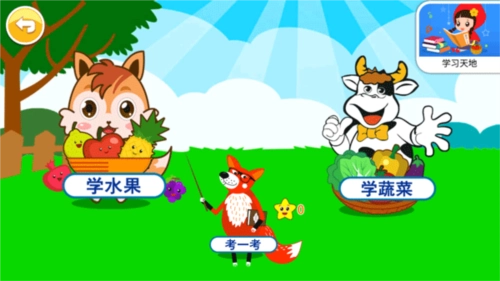 3、小朋友还能选择水果认知板块,其中设有学水果和学蔬菜这两个学习区域,以此增强小朋友对水果蔬菜的认知。