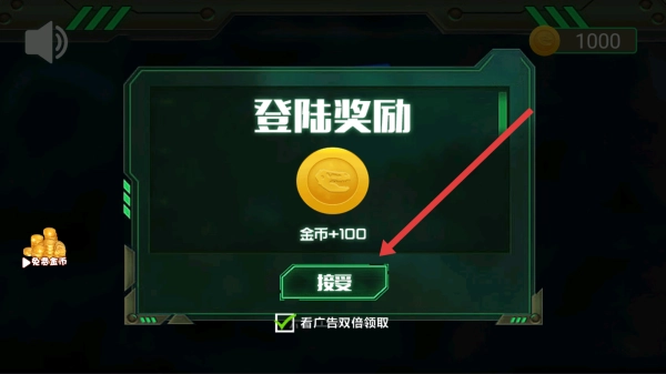 1. 在登录奖励界面,点击“接受”按钮,即可获取100金币奖励。要是勾选“看广告双倍领取”,还能够选择观看广告,从而获得更多金币。
