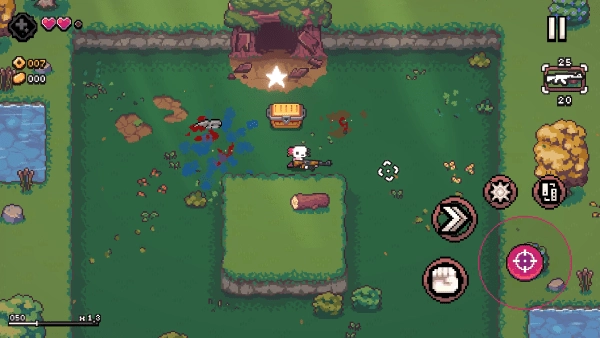 通过移动来瞄准敌人并进行射击,成功击败敌人后,会有宝箱掉落,其中部分宝箱还会掉落武器。