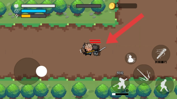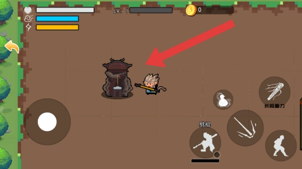 2、玩家的形象类似孙悟空,手持金箍棒。界面左上角显示等级为LV.1,右下角设有诸如黑熊棍、长棍暴打等技能按钮,这是一款西游题材的像素风格动作游戏。