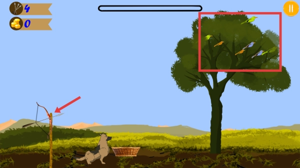 2、拿起弓箭,将其对准树上的鸟,等待合适时机。操作时,只需按住屏幕来拉弓,待时机成熟松开手,箭便会朝着目标方向发射出去,努力尝试击中目标。