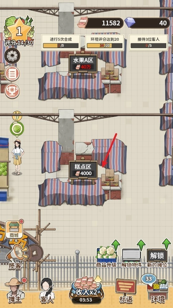 1. 开启这款游戏之后,首先利用启动资金解锁摊位。