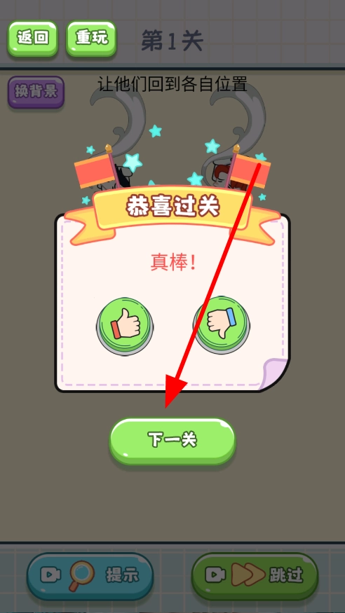 3、成功使人物回到各自位置后即可通关,通关后可点击“下一关”,继续挑战新关卡,体验更多内容。
