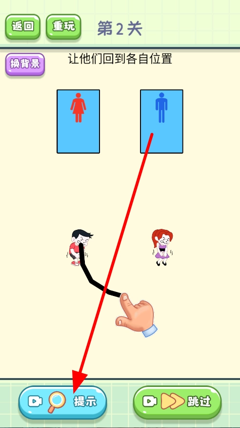 4、若在关卡挑战时遭遇困难,可点击提示按钮,获取相关提示,借助这些提示更顺利地完成画线及人物归位操作。
