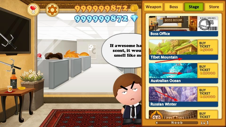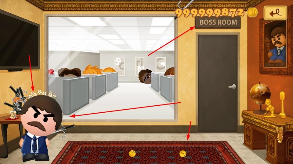 2. 在办公室之类的场景里进行移动探索,对老板展开攻击,场景中存在可以收集的金币。