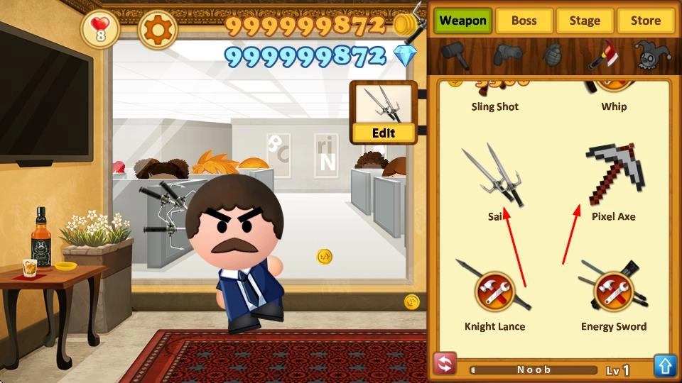 1. 在武器界面,你能够选择多种武器,比如Sai、Pixel Axe等等。不仅如此,还可以对武器进行涂装,自由挑选颜色与纹理。