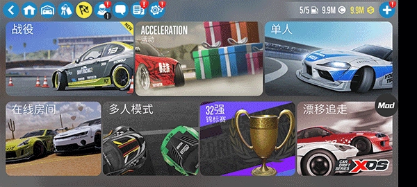 1. 在首页进入游戏界面后,点击车身标志,在此处既能购买赛车,也能为车手购置一整套帅气的赛车服装。