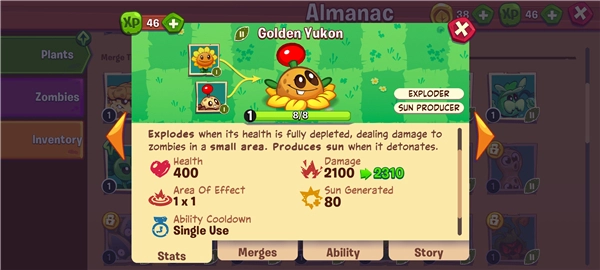 死亡时发生爆炸并生成阳光(此技能与融合版的那个技能有所不同,反倒类似弱化版锑食的辣椒粉技能)
