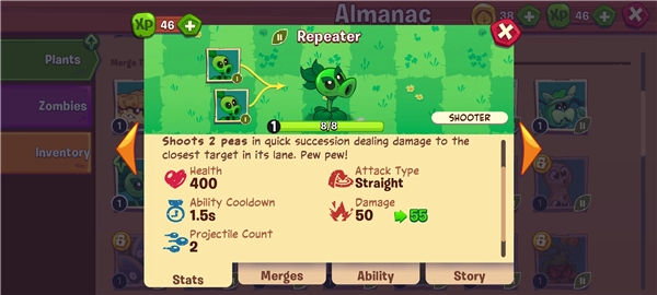 双发射手射出的豌豆数目是普通豌豆射手的两倍,并且只要有机会就会炫耀。它们还有个习惯,总爱重复自己说过的话,就像:你晓得双发射手发射的豌豆数量是普通豌豆射手的两倍不?咦,你知道呀?那就只是确认一下。此外,双发射手很少会接到长途驾车旅行的邀请。