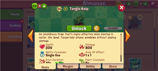 “来吧,僵尸们——这水可棒啦!”它们心里如此想着……缠绕海草正暗暗潜伏着,时刻准备逮住敌人,把对方拖进幽深昏暗的海底,让其永无重见天日之时。而在陆地上,她的杀伤力就没那么强了(她对自身的气囊稍微有些敏感) 。